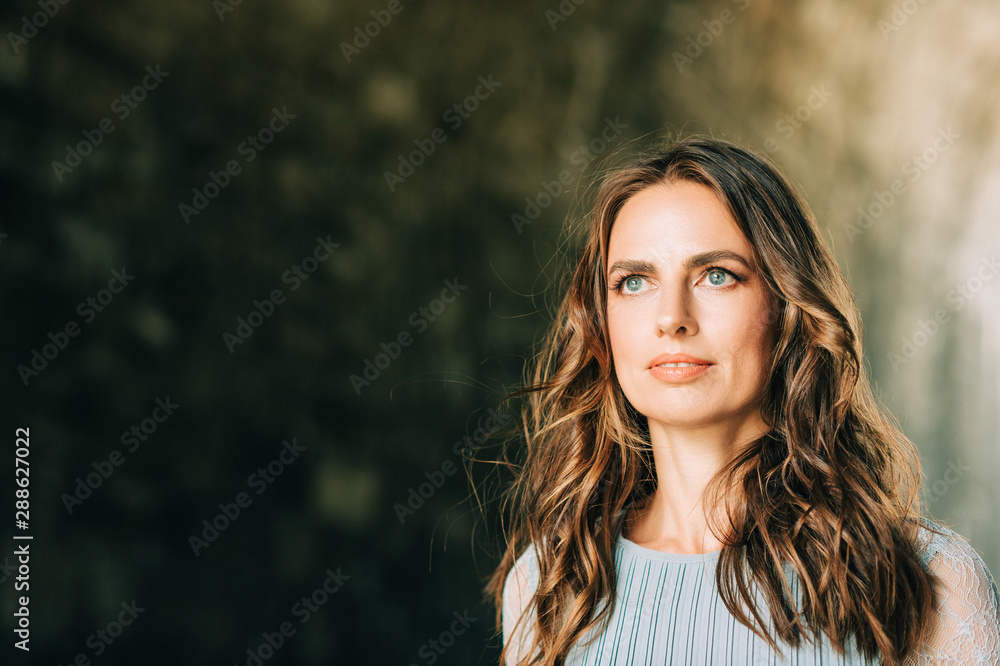 Outdoor portrait of beautiful woman with curly hair, wearing blue dress, looking up