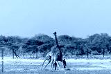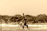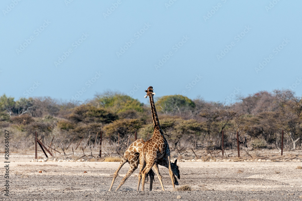 Two Male Angolan Giraffes - Giraffa giraffa angolensis- fighting by hitting each other with their long necks. Etosha National Park, Namibia.