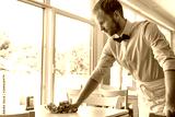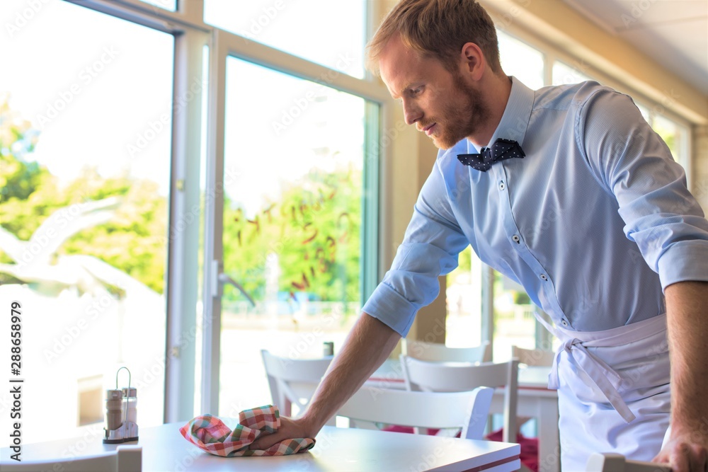 Waiter cleaning the table at restaurant