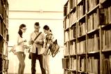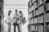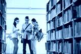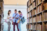 Friends discussing while reading book at library in university