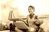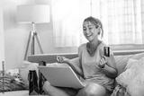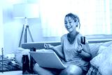 Young woman holding credit card and using laptop computer. Online shopping concept. Happy woman doing online shopping at home