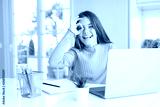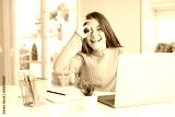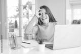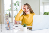 Beautiful young girl studying for school using computer laptop with happy face smiling doing ok sign with hand on eye looking through fingers
