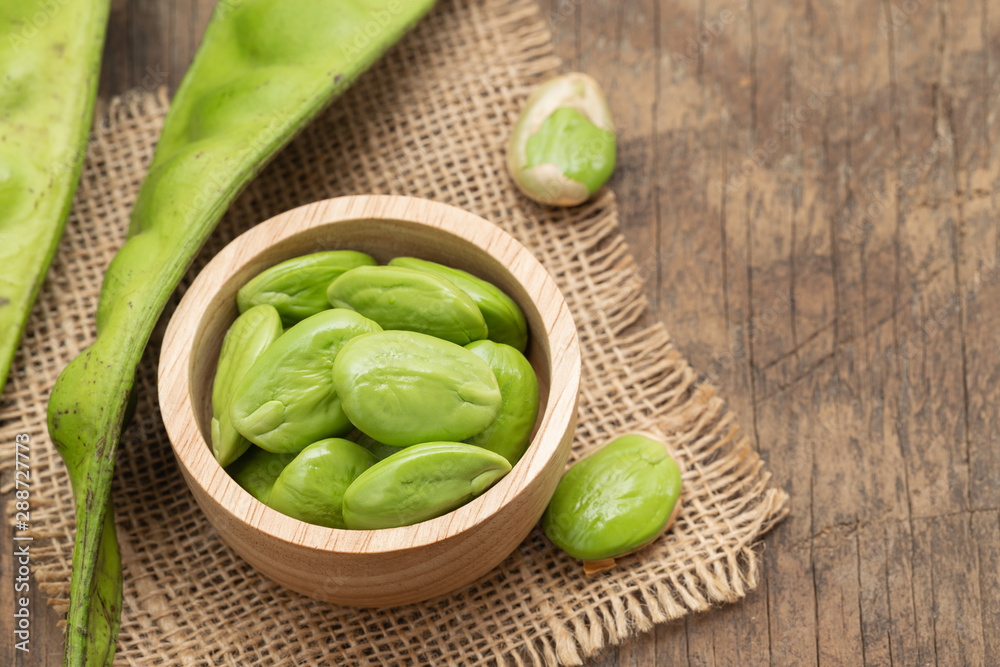 Sato seeds, Bitter bean in the Wooden bowl, Sack, Old grunge dark textured wooden background, Thai vegetable food