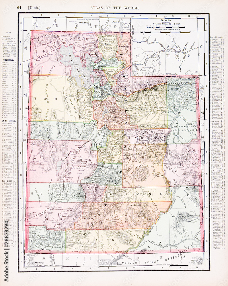 Antique Vintage Color Map of Utah, UT, United States, USA