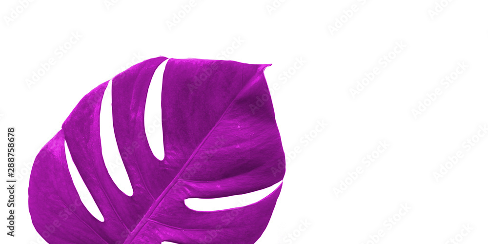 Tropical leaf of monstera philodendron plant toned to purple color isolated on white background, copy space.