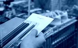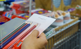 Student girl comparing school products in stationery shop. Back to school concept photo in a hypermarket. Beginning of the new training / education season. Blurred background.