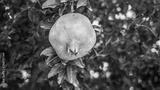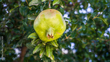 Closeup of pomegranate on pomegranate apple tree branch. Agricultural background photo. Organic nutrition, healthy lifestyle, clean eating concept. Vitamin c supply. Selective focus.
