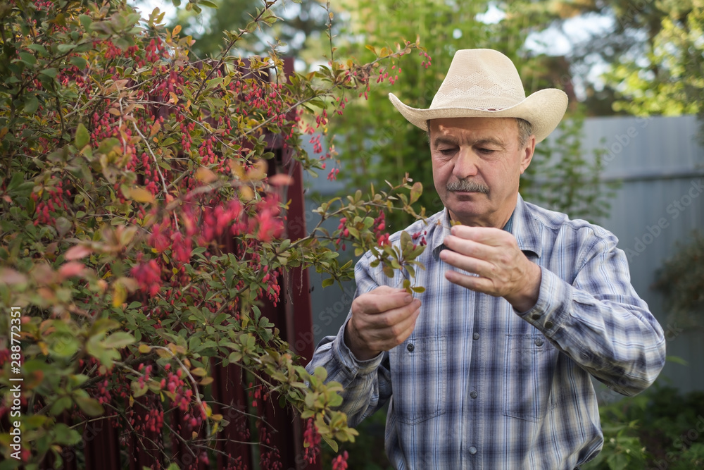 Farmer checking barberry branch with fresh ripe berries at his garden.