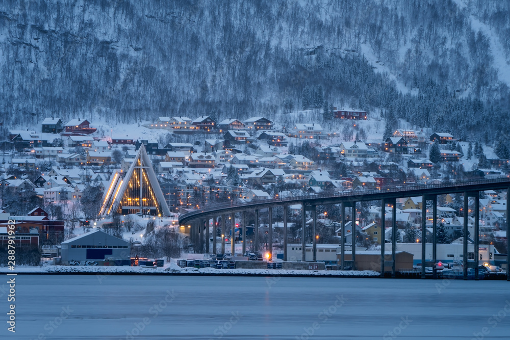 Arctic Cathedral and bridge across Tromsoysundet strait