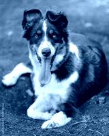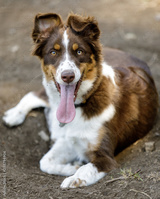 Australian Shepherd male puppy panting. Off-leash dog park in Northern California.