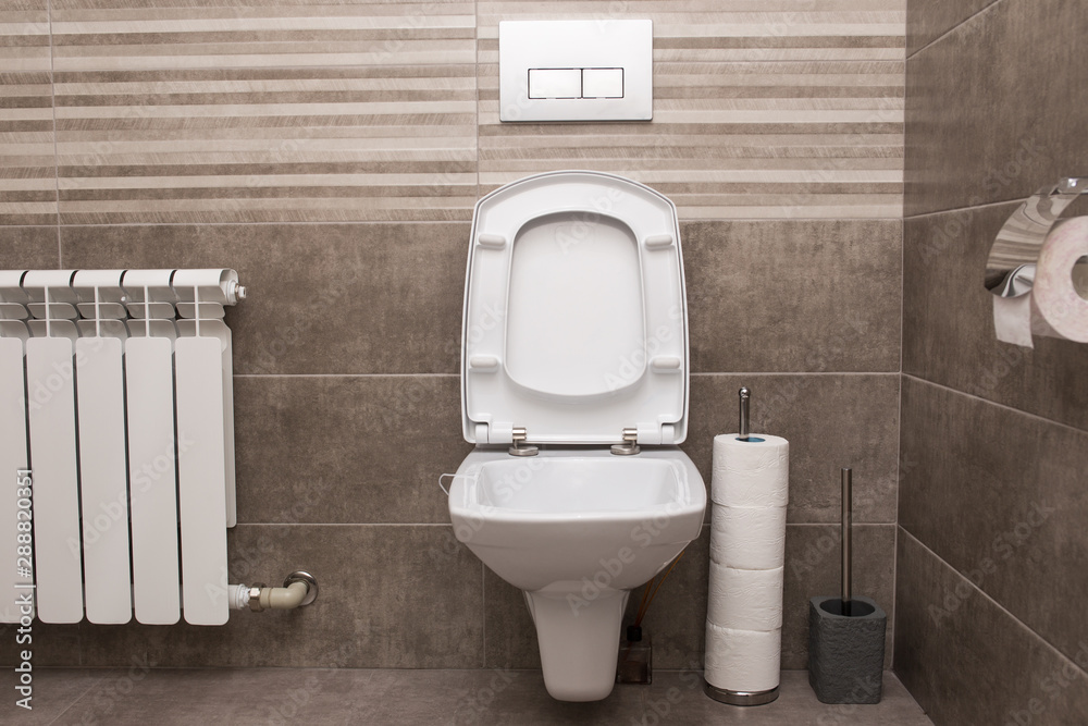New white ceramic toilet on a gray tile background. The interior of the restroom.
