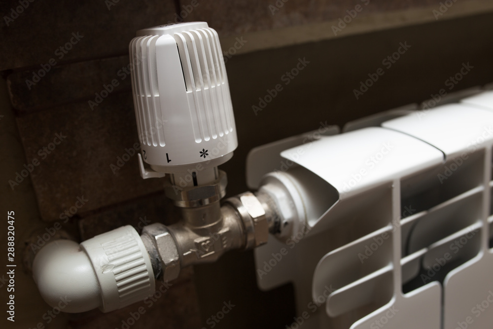 White radiator in the bathroom close-up. Heating. Tiled gray wall.
