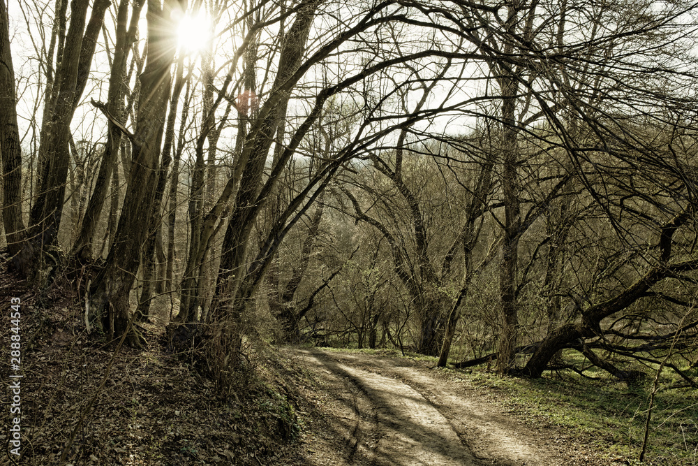 Forest path and sunbeam. HDR image with black gold filter