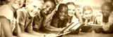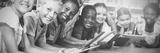 Teacher and kids lying on floor using digital tablet in library
