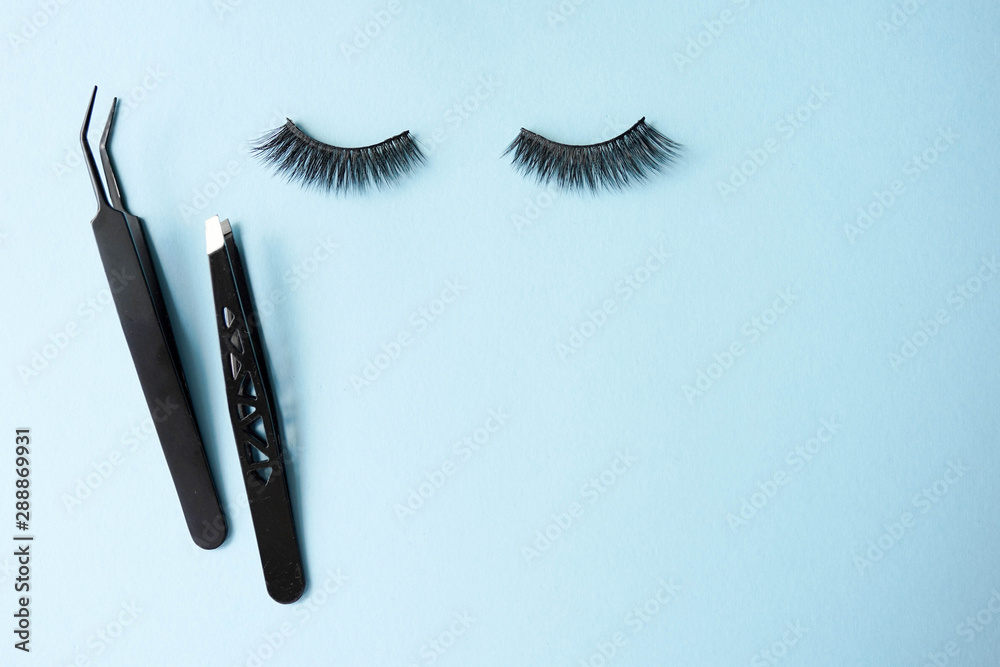 False eye lashes, black tweezers on blue background with copy space, mockup. Beauty concept - Tools for eyelash extension.