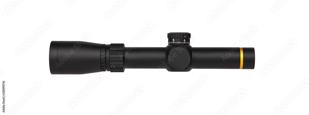 modern black optical scope for weapon isolated on whited. sight scope isolated on white back.