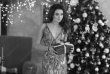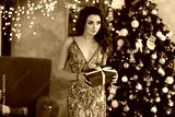 Sexy and fashionable model girl with blue eyes and bright makeup in stylish evening dress keep red gift box and posing near Christmas tree in interior decoration for New year