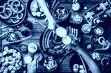 Flat-lay of Oktoberfest dinner table with grilled meat sausages, pretzel pastry, potatoes, cucumber salad, sauces, beers and peoples hands clinking glasses over dark wooden background, top view