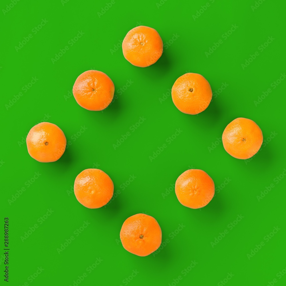 Fruit pattern of fresh orange tangerine or mandarin on green background. Flat lay, top view. Pop art design, creative summer concept. Citrus in minimal style.
