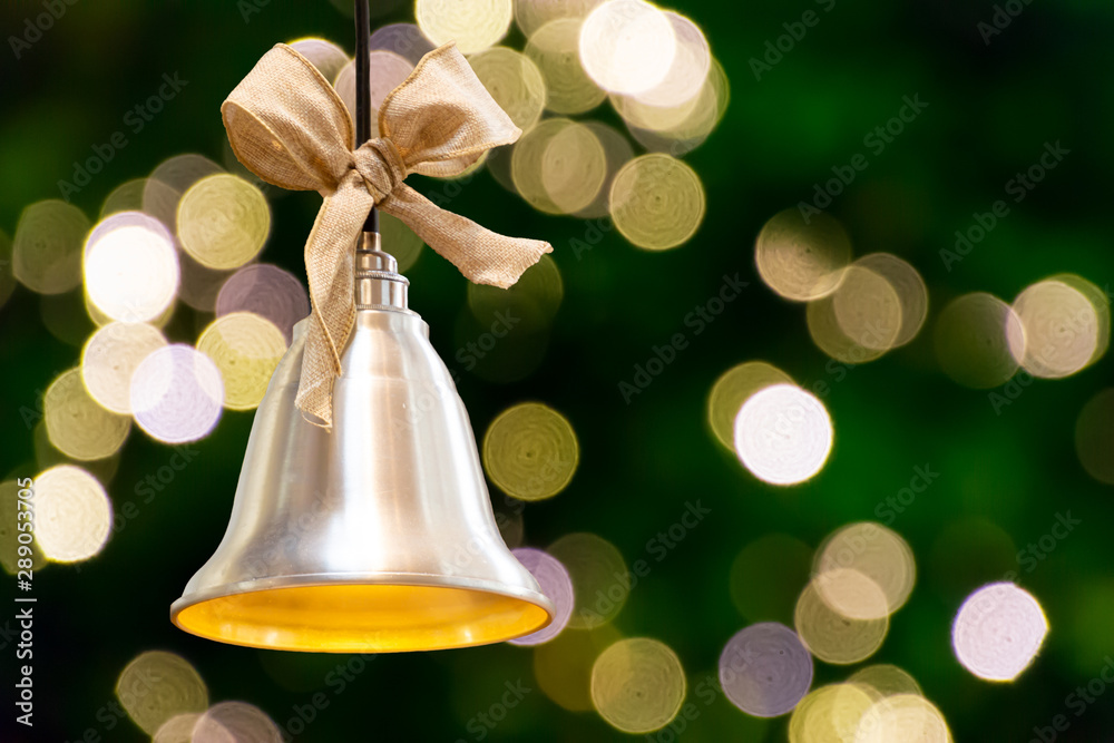 Golden bell on green blurred Christmas tree background with bokeh lights. Copy space