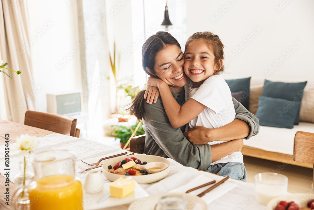 Image of happy family mother and little daughter hugging while having breakfast at home in morning