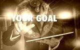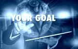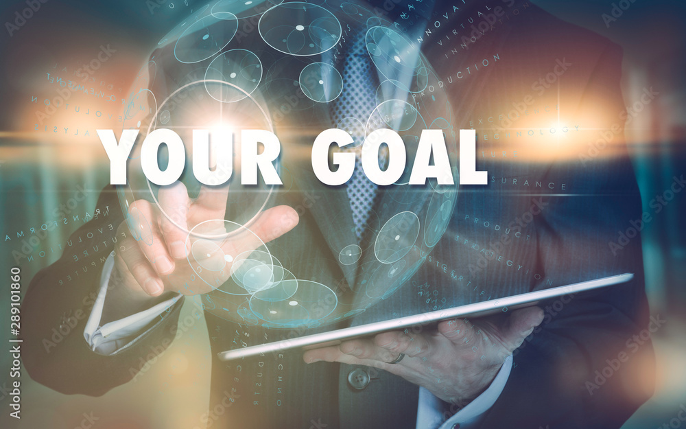 A hand selecting a Your Goal business concept on a futuristic computer display.