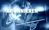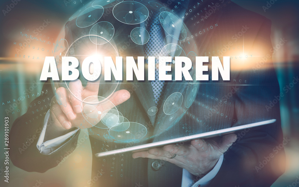 A hand selecting a Subscribe "Abonnieren" business concept in German on a futuristic computer display.