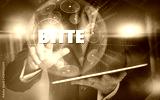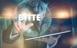 A hand selecting a Please "Bitte" concept in German on a futuristic computer display.