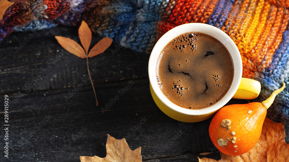 Yellow espresso coffee Cup on wooden table with autumn leaves, pumpkin and colorful autumn warm scarf . Warmth and comfort . Copy space