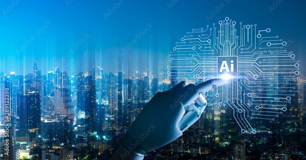 Artificial intelligence , Robot finger,robo advisor ,Big data, robotic future technology and business concept.Robot finger on blurred background using digital artificial intelligence interface.
