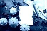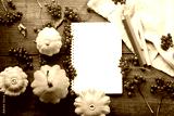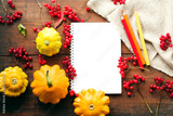 Bright autumn background. Flat white notebook for your text, colored pencils, squash and bunches of viburnum on a wooden surface, top view