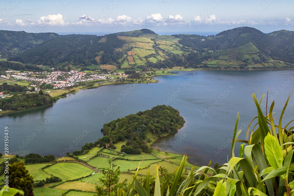 Viewpoint Miradouro do Cerrado das Freiras - view of Lagoa Azul and the village Sete Cidades in Azores