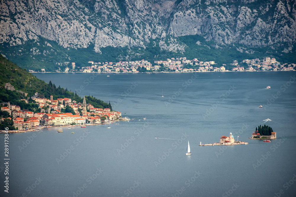 Panoramic View of the Bay of Kotor with The small islands of Ostrvo and Sveti Juraj monastery , Montenegro