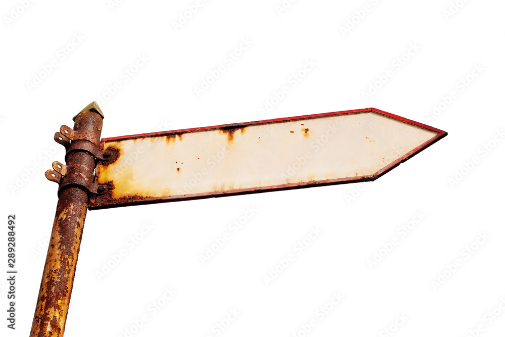 Vintage rusty signpost isolated on white background. The empty board is suitable for text.