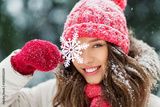 people, season and christmas concept - portrait of happy smiling teenage girl or young woman with snowflake in winter park