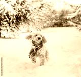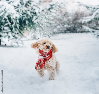 Cute and funny little dog with red scarf playing in the snow. Happy puddle puppy having fun with snowflakes.