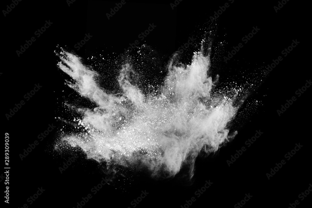 White powder explosion on black background. Colored cloud. Colorful dust explode. Paint Holi.