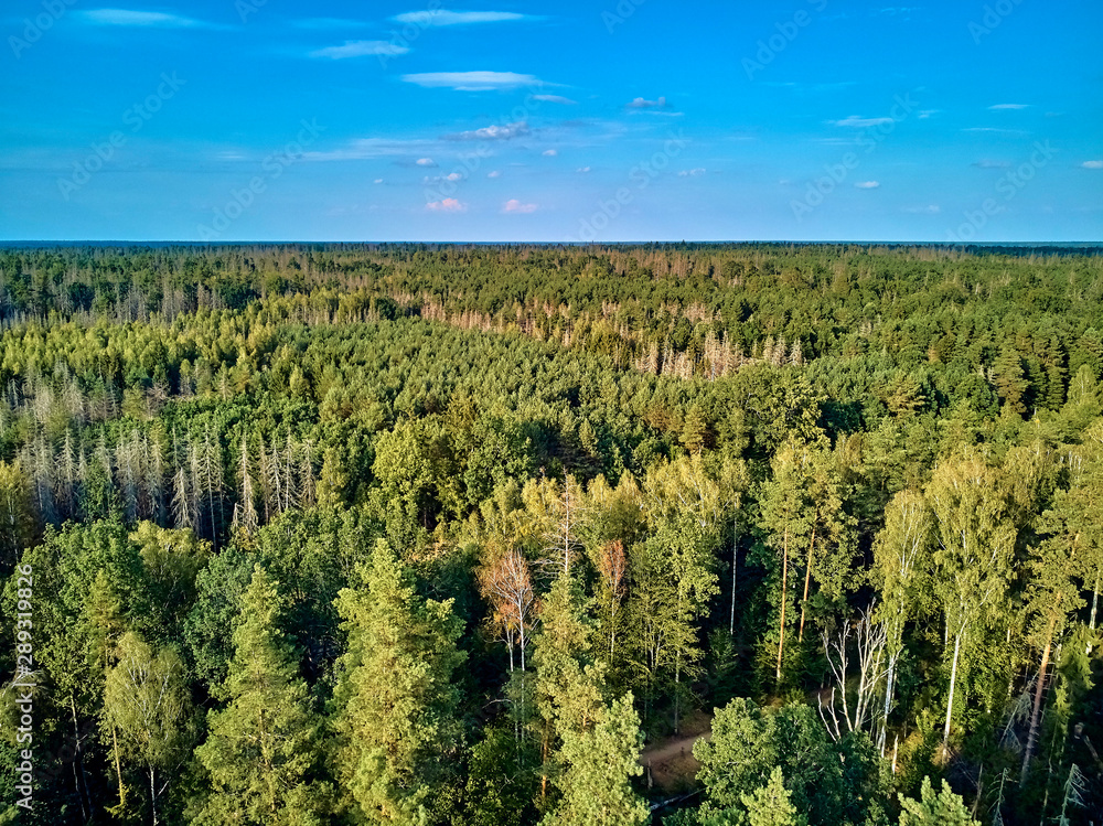 Beautiful panoramic aerial drone view to Bialowieza Forest - one of the last and largest remaining parts of the immense primeval forest that once stretched across the European Plain