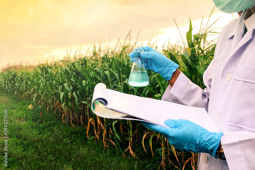Agricultural scientist researching plants/diseases in corn plantation. Biotechnology examining plant leaf disease. Scientist observing/analyze chemical reactions in corn field using report/lab tools.