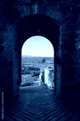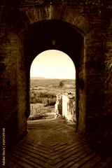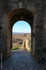Beautiful view to the tuscany landscape through the gates of medieval town Monteriggioni, Tuscany, Italy