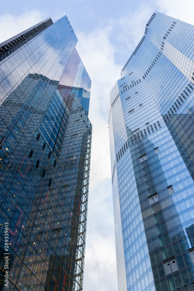 Concept of financial economics future. Business offices skyscrapers on blue sky background.