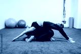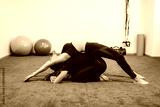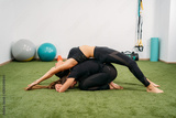 A girl on top of another woman, both dressed in black sportswear, do a physical stretching exercise with rubber balls in the background. Concept of muscle health and relaxation.