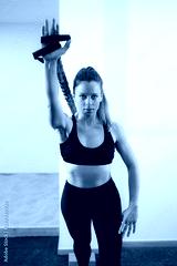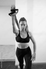 Pretty young girl dressed in black clothes doing a stretching exercise with a support embedded in the wall. Concept of muscle health and relaxation.