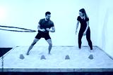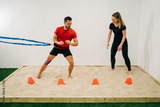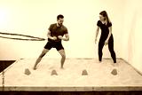 Man does stretching exercises on sand with a blue support at the waist, assisted by a physiotherapist girl, a white wall in the background. Concept of muscle health and relaxation.