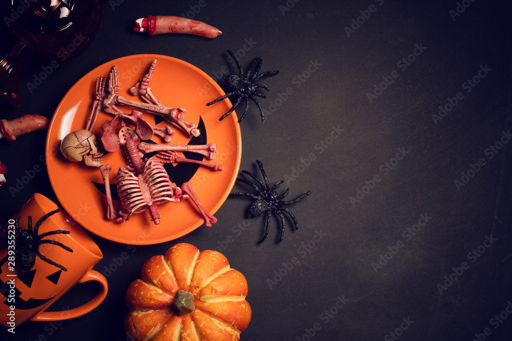 horror spooky funny ghost in halloween pumpkin holiday season greeting night celebration party with toy prop decoration in top view flatlay and trick of treat festival concept