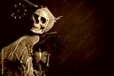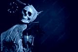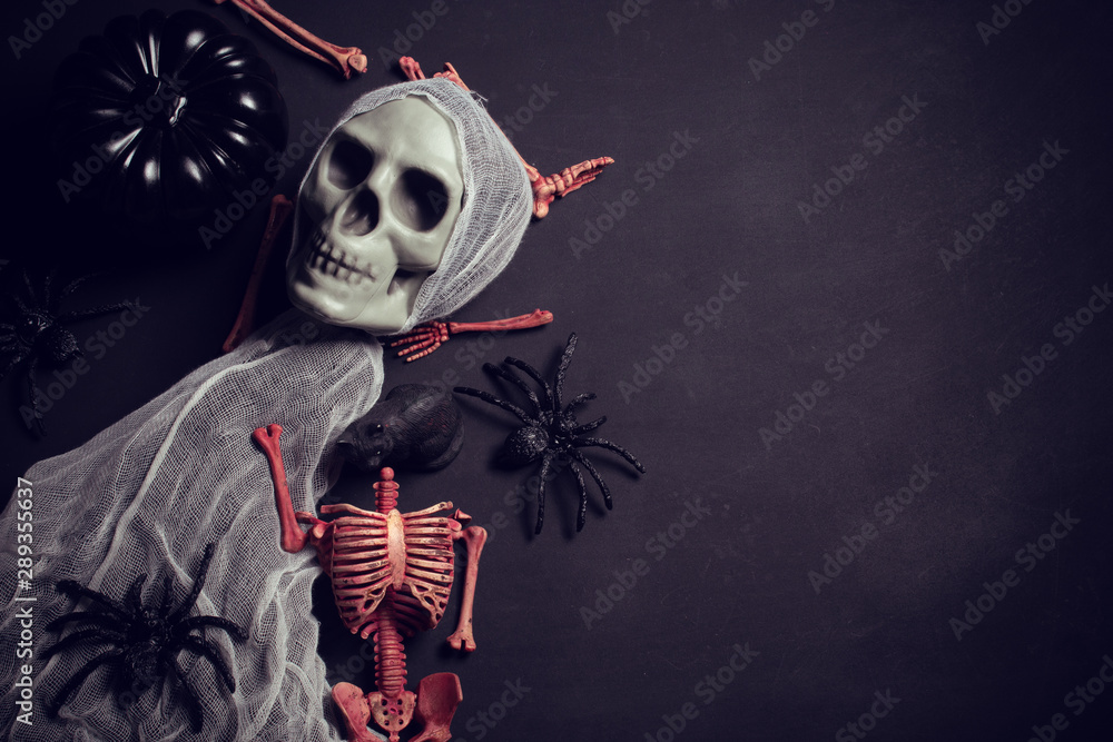 horror spooky funny ghost in halloween pumpkin holiday season greeting night celebration party with toy prop decoration in top view flatlay and trick of treat festival concept