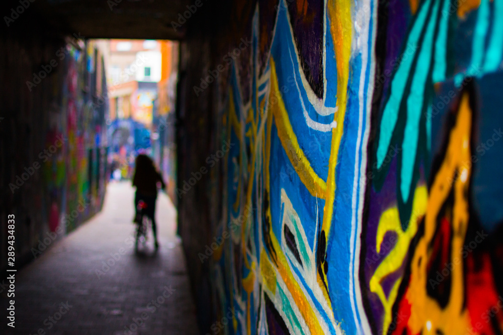 Close up of a blue and yellow graffity in Werregarenstraat (Graffiti Street) in Ghent, Belgium, Europe, with defocused background with a person on a bike. Colorful famous street in the old town