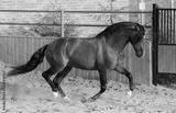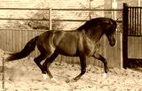 Bay Andalusian horse gallops in paddock.