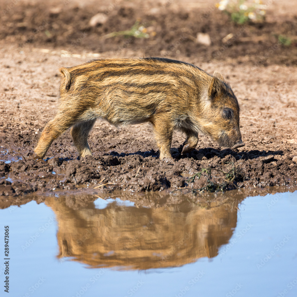 Baby wild boar reflected in a puddle
