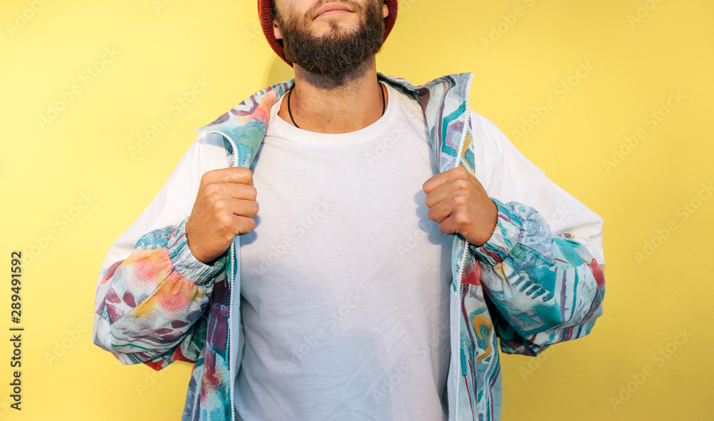 Stylish young hipster man with beard in red hat and a retro jacket of 90s on yellow background. white blank t-shirt with space for your logo or design.